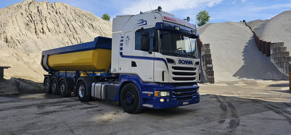 Wir bieten mit unserem Scania-Schlepper und seinem Kipper-Auflieger das ideale Fahrzeug für flexible Einsätze.